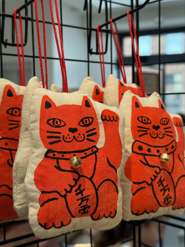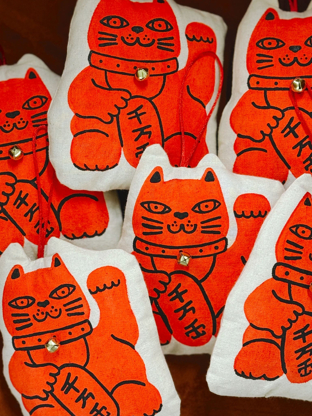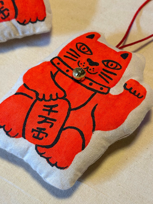 Welcome luck all year round with this vibrant handmade lucky cat by Tommy Pang. Each one is handpainted on unbleached cotton, making every cat truly unique with its own personality.